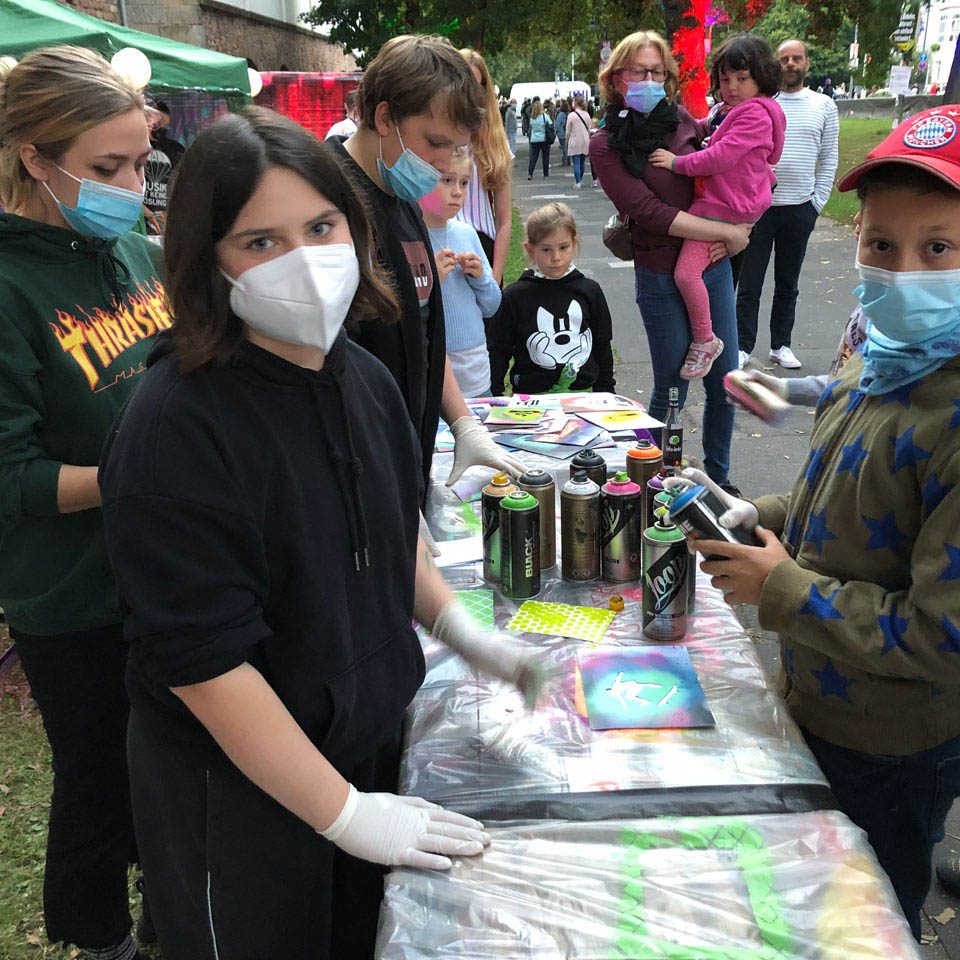 Bei Veranstaltungen von Kooperationspartner*innen stehen wir gerne mit einem Mitmach-Schablonengraffiti-Stand zur Verfügung.